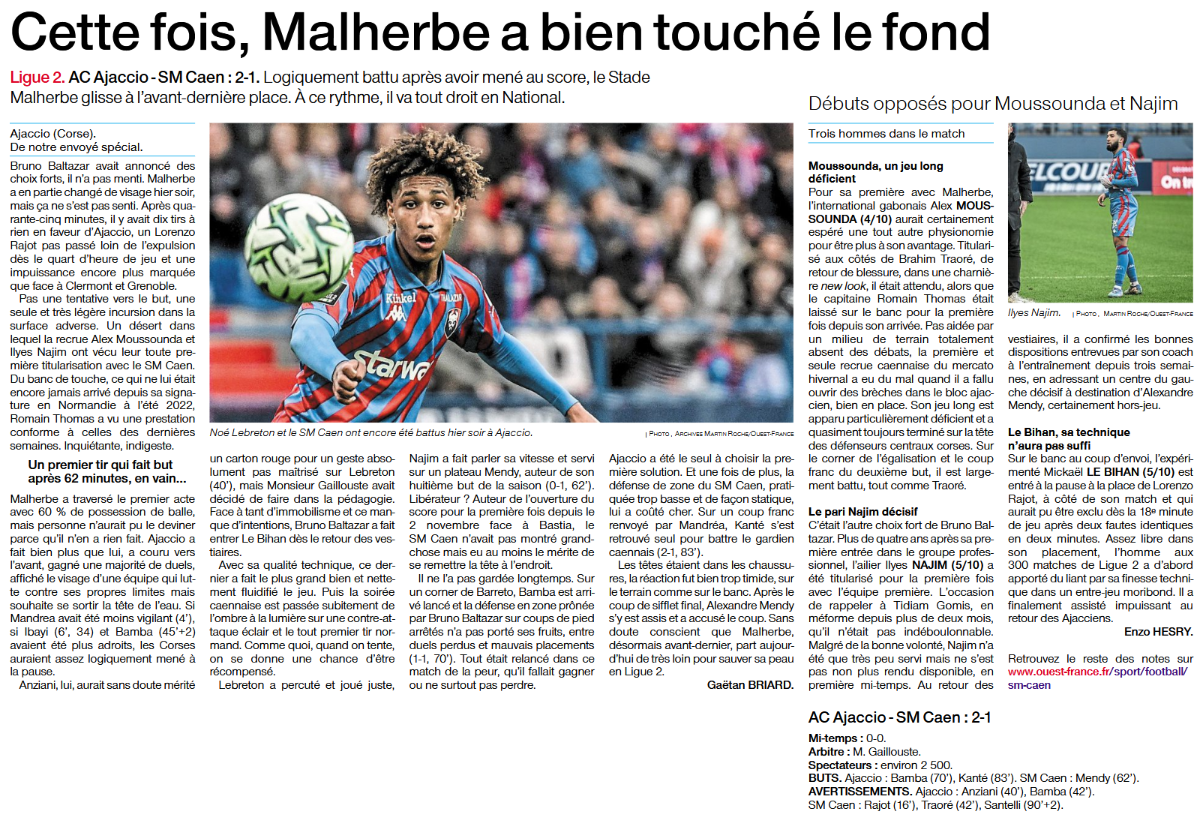 MOUSSOUNDA (4). Pour sa première avec Malherbe, l’international gabonais aurait certainement espéré une tout autre physionomie pour être plus à son avantage. Titularisé dans une charnière new look, il était attendu, alors que le capitaine Romain Thomas était laissé sur le banc pour la première fois depuis son arrivée. Pas aidée par un milieu de terrain totalement absent des débats en première période, la première et seule recrue caennaise du mercato hivernal a eu du mal quand il a fallu ouvrir des brèches dans le bloc ajaccien, bien en place. Son jeu long est apparu particulièrement déficient et a quasiment toujours terminé sur la tête des défenseurs centraux corses. Sur le corner de l’égalisation et le coup franc du deuxième but, il est largement battu dans le duel.